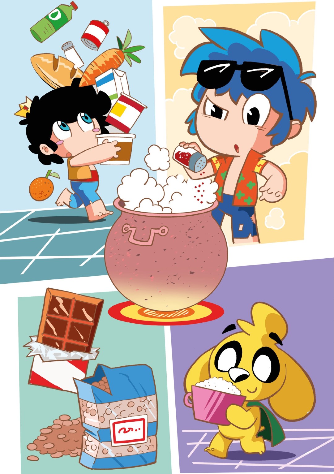 —A ver, chicos. No nos pongamos a discutir ahora —intervino Timba con su habitual pachorra. El muchacho quería terminar pronto para echarse una siestecita, de modo que se remangó la camisa y se puso a trabajar sin demora. Mike y Trolli hicieron lo mismo, pero como no tenían muy claro los ingredientes que debían usar, fueron a la despensa y empezaron a echar todos los alimentos que vieron. Un poco de harina por aquí, un trozo de pera por allá, mayonesa, zumo de naranja, calabacines… Una mezcla de lo más absurda.