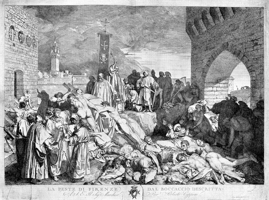 En Florencia la situación era aún más extrema.54Se calcula que, al final de este brote inicial, dos terceras partes de una población de 100.000 florentinos habían muerto. La idea más vívida de lo que debió de ser la situación en la ciudad procede de Boccaccio: aunque probablemente no estuvo allí durante esa época, conocía a gente que sí, e incluyó un breve pero espeluznante relato de la misma en el preludio al Decamerón. En él se establece el escenario, ya que los diez narradores son diez jóvenes nobles que huyen de la ciudad para esperar a que pase el peligro en sus confortables casas de campo. Boccaccio describe con exactitud de qué huían, y se disculpa ante los lectores por recordarles horrores que aún estaban recientes en sus mentes y que probablemente preferirían olvidar.