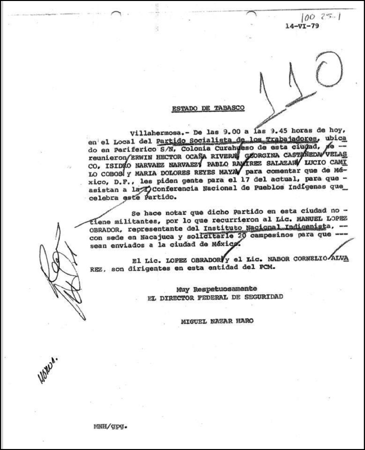 Aunque no todos pensaban igual. De aquel entonces son los reportes del terrible director de la Policía Federal de Seguridad, Miguel Nazar Haro, quien me calificaba de comunista. Como en el reporte fechado en 1979 (véase p. 27).