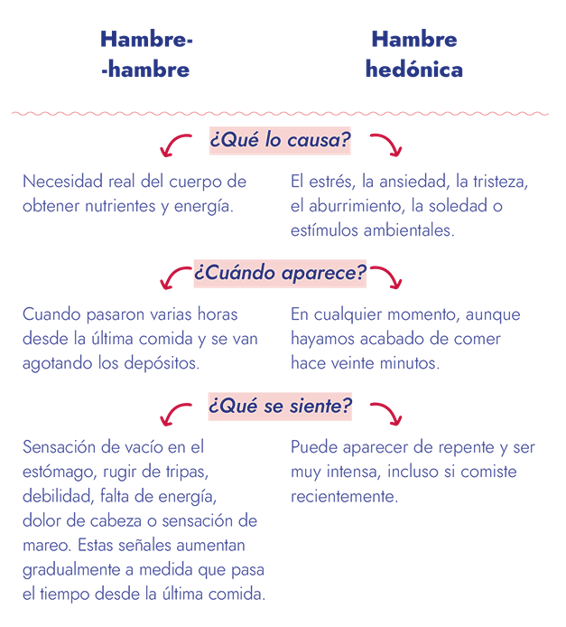Podemos agrupar el hambre emocional y el hambre ambiental dentro de lo que se conoce como hambre hedónica. No en vano, la palabra hedonismo viene del griego hēdonḗ (ἡδονή), que significa ‘placer’.