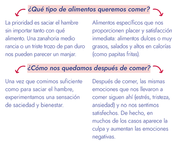 2. El hambre emocional. Lo malo es que el estrés, la ansiedad o el aburrimiento también pueden provocar sensación de hambre, aunque no tengamos hambre-hambre de la buena. Si lo que tenemos es hambre emocional, nuestro cerebro puede desear comida y disfrutar de ella, aunque los depósitos de energía estén llenos y nos sintamos completamente saciados. En estos casos, recurrimos a la comida como una forma de afrontar o satisfacer estas emociones. En ese momento el copiloto caprichoso está al mando.