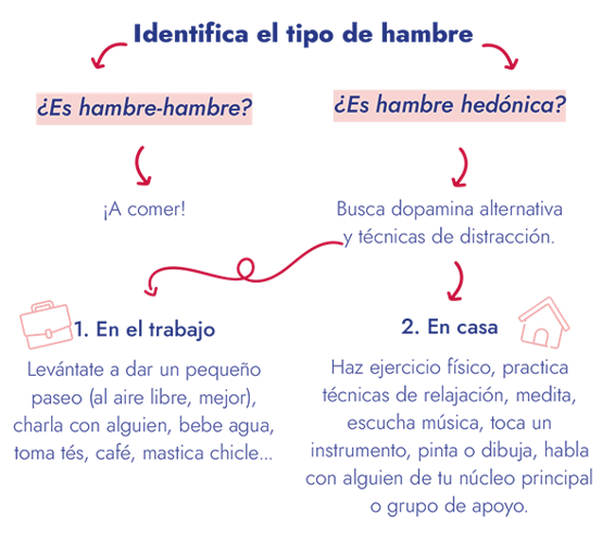 * En casa. Si el hambre hedónica te atrapa en casa y tienes algo más de tiempo, intenta practicar alguno de tus hobbies, como leer un libro o una revista que lleves tiempo queriendo terminar. Escucha música, pon tu playlist favorita para cantar con pasión, toca un instrumento si tienes esa habilidad (está demostrado que libera dopamina), pinta o dibuja si eso te relaja…, o simplemente intenta cortar ese impulso haciendo cualquier otra actividad que relegue la comida a un segundo plano. Como vamos a ver enseguida, hablar con tu núcleo principal o con alguna persona de tu grupo de apoyo en estos momentos también puede ayudarte.