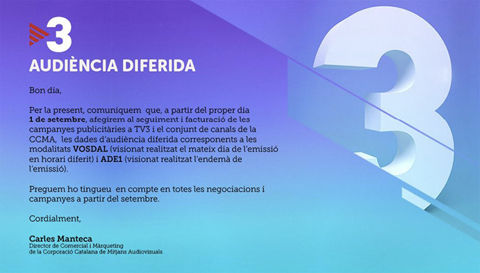 Entre las nuevas acepciones del término audiencia, está la vinculada a la que consume programas aplazados en el tiempo, a la carta (o, si se quiere, al gusto del consumidor), a través de servicios de televisión a la carta (catch-up) de los distintos canales después de su emisión lineal, meses después de su primera explotación comercial. Es la conocida como audiencia diferida. Así es como la Dirección Comercial y de Marketing de la CCMA (TV3) comunicaba en agosto de 2016 que la integraba en sus tarifas publicitarias: