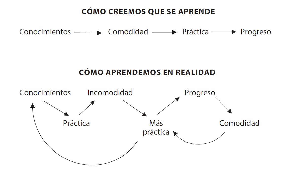Mientras hablaba con Sara sobre su gran revelación, a mí se me encendió la bombilla. La comodidad en el aprendizaje es una paradoja. Es imposible que te sientas cómodo con una habilidad hasta que no has practicado tanto que ya la dominas del todo. En cambio, practicar esa habilidad antes de dominarla resulta muy incómodo, por lo que a menudo evitamos pasar por ahí. Acelerar el aprendizaje requiere una segunda forma de valentía: tener el valor suficiente para usar los conocimientos a medida que se adquieren.