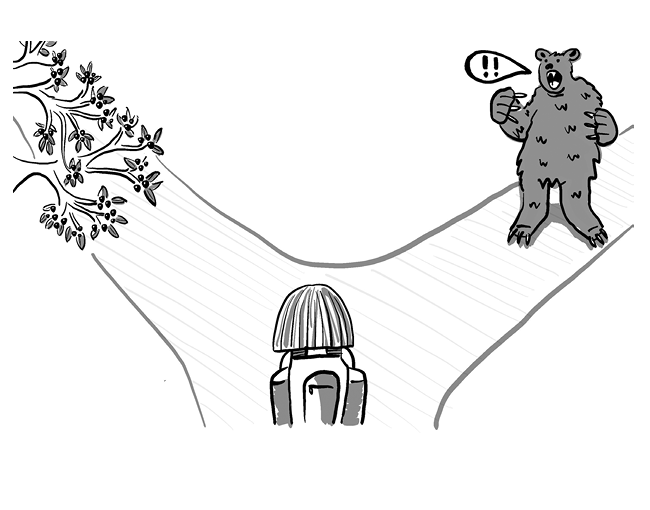 Entonces el sendero llega a una bifurcación. Al mirar hacia uno de los caminos que se abren, ves, bajo la resplandeciente luz del sol, un arbusto de arándanos silvestres, alto y frondoso. Al mirar el otro camino, ves un oso pardo enorme que te muestra los dientes desde las sombras. ¿Qué camino eliges?