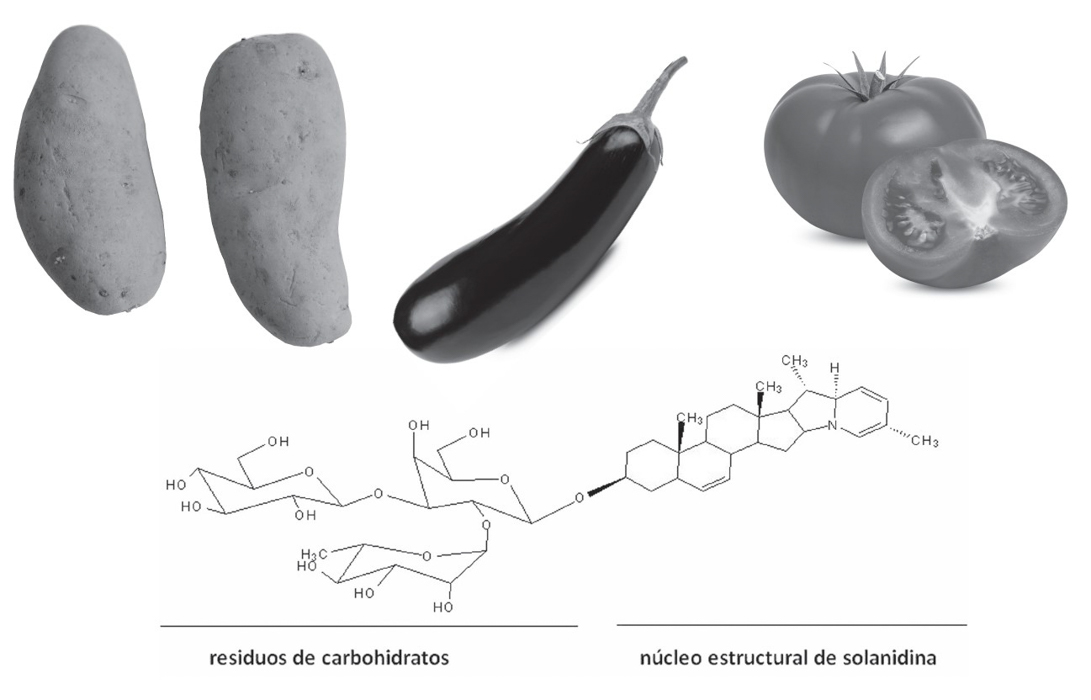 A pesar de esta enorme diversidad, tienen algo en común, y es que podríamos considerarlas como una verdadera fábrica de alcaloides, lo que ha originado que algunas especies sean mundialmente conocidas por sus usos medicinales, sus efectos psicotrópicos o por ser ponzoñosas. Si hurgamos entre ellas, encontraremos la que da nombre a esta familia, la solanina. Es un glucoalcaloide (o glicoalcaloide), es decir, contiene un azúcar y un alcaloide variable según se trate de patata (solanidina, chaconina), tomate (tomatidina) o berenjena (solasodina), mayoritario en hojas, frutos y tubérculos. El término solanina es un genérico para el alcaloide que forma parte de estas moléculas. Su sabor es amargo, y es por algo. La producción de estas moléculas es una estrategia de defensa contra herbívoros, lo que significa que sabe amargo para que el animal la pruebe y no coma más. Es el mejor mecanismo disuasorio, y, si insistes, tendrás alteraciones gastrointestinales (diarrea, vómito, dolor) y neurológicas (alucinaciones y dolor de cabeza) si ingieres 140 miligramos y pesas 70 kilos. A ver, ¡te lo está diciendo el sabor! ¿Qué ocurre? Pues que las plantas silvestres, como el estramonio, el beleño o la mandrágora, de las que luego te hablaré, no nos suponen un problema grave porque normalmente nadie se las come. Sin embargo, algunas de las plantas que tienen este alcaloide son importantes cultivos agroalimentarios, como la patata, el tomate, la berenjena o el pimiento. Todas fueron plantas silvestres hasta que llegó el hombre, las domesticó y dejaron de serlo. Eso ha supuesto que, por selección artificial, durante miles de años se hayan ido eligiendo los individuos que acumulaban menos alcaloides, hasta que llegamos a las variedades actuales, que tienen una pequeñísima cantidad de solanina. La patata de hoy tiene mil veces menos solanina, y el tomate «se deja comer» (el ancestral era tóxico). En el tomate no se ha reducido tanto el contenido como en la patata, pero siempre que no te lo comas verde, todo irá bien. Conforme va madurando, va perdiendo concentración, así que mejor maduros, y, si no, acuérdate del título de aquella película, Tomates verdes fritos.