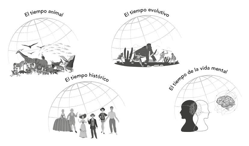 Bueno, yo decidí hacer un acto filosófico de absoluta limpieza de todo prejuicio, teoría o propuesta de si existe la adolescencia, y eso implicó darme a la tarea de partir desde cero o, más bien, desde el inicio de los tiempos de la vida. Es decir, que si mi objetivo es mostrarles un genuino volver a mirar la adolescencia, no podía darme el lujo de partir con preconcepciones o prejuicios sobre esta etapa del desarrollo. Para lograr esa tremenda tarea solo tuve que aplicar un método de pensamiento que ya se encuentra en mí desde hace muchos años y que podemos llamar la metodología de la máquina del tiempo. Esta consiste en seleccionar un fenómeno (en este caso, la adolescencia) y empezar a retroceder en el tiempo en cientos, miles y millones de años, para saber si el fenómeno en cuestión ha emergido como una parte integral de eso que llamamos vida terrenal. Mi expectativa es que la adopción de este tipo de metodología podría arrojarme importantes luces sobre si eso que llamamos “adolescencia” se encuentra en lo más profundo de nuestra biología o si más bien es un producto de las civilizaciones y culturas modernas. Pero viajar en el tiempo no es una tarea fácil, ya que estamos hablando de un viaje hacia el centro del inicio de la vida misma y eso implica tramos de eones de temporalidad. Por eso, dichos tramos los decidí dividir en cuatro mundos temporales (ver imagen): el Animal, el Evolutivo, el Histórico y el de la Vida Mental. Les tengo que decir que los estudios actuales de la memoria han encontrado que los humanos y animales solemos viajar hacia el pasado para comprender y modificar nuestro presente y futuro. Por esto, espero que el viaje hacia el pasado de la adolescencia les ayude a mirar y cambiar el presente y futuro de nuestros/as adolescentes.