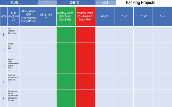 It’s important, however, to ensure that, no matter the methodology you use, you are able to plan but also do, check and act. In the end, the deployment of the strategy can be seen as one big PDCA cycle, as reflected in the structure of the board below.