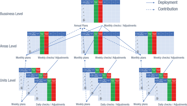 The big strategic issues that make up your Hoshin plan need to be broken down into smaller problems to be solved at lower levels of the organization, and the key tool for the resolution of such problems is A3 Thinking. This means deploying strategic goals from the top down, translating them into goals specific to each and every individual or function within the business, so that, in response, they will come up with the necessary solutions. This isn’t to say that indicators have to be the same at top level and front line, but that there needs to be a lag-lead relation between them. For example, the consolidated costs in an organization can be divided into different areas of the Hoshin plan. By managing their costs, each area will contribute to the global objective.