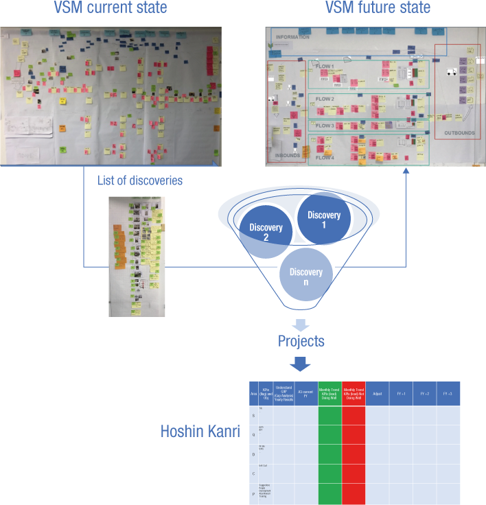 Because it shows all the problems you have in the organization, the VSM can act as an input for Hoshin. It gives you a backlog of projects. This is why the VSM has to be present in the Boardroom: it gives you a plethora of possible projects you can work on, and Hoshin will then help you to select the most critical for you to focus on.