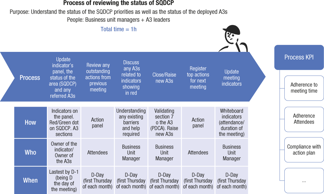 The definition of a standard for governance gives people a template to follow during each and every meeting, and ensures accountability. You can see a board and use it in any way you want, but there are certain rules of engagement that need to be followed if the process is to unfold the way it’s supposed to. Just like you can’t play Monopoly with a different rulebook for each player, so there has to be one way for each individual to participate in the Hoshin meeting and interact with the board. This standard will tell you the who, when, how for each section of the board. For example, who has to update a certain piece of information? How often? Using what tool? This is vital, because it creates the rules of the game. As we will see in the examples at the end of the book, this means engaging in a real development effort to teach people how to participate in the meetings.
