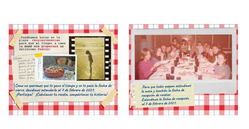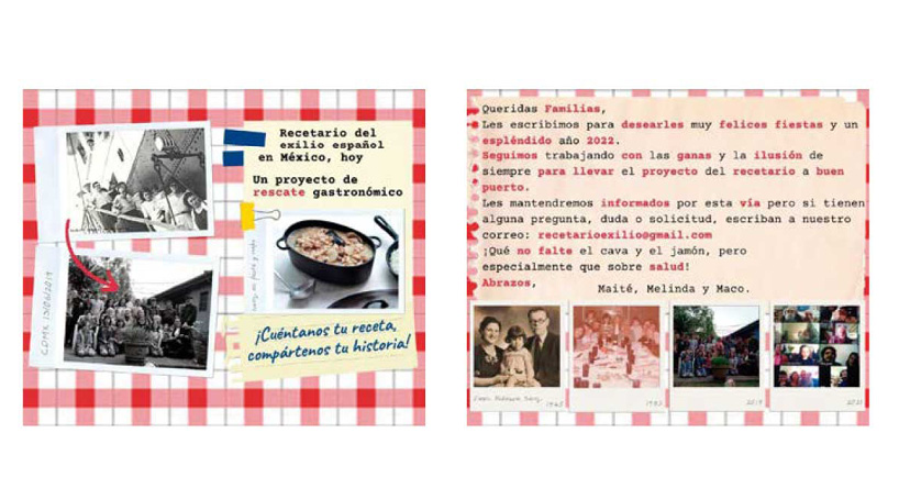 Cuando se planteó cuál metodología aplicar para recabar las recetas y las historias por incluir en esta compilación, se decidió lanzar una convocatoria en redes sociales digitales y así facilitar la participación de gente no cercana al círculo de familias y amistades de las editoras, y dar acceso a miembros de la comunidad del exilio residentes de todos los estados de la República mexicana. La respuesta obtenida rebasó con creces las expectativas, ya que se recibieron 130 recetas. Sesenta familias –que llegaron recién acabada la guerra civil, o décadas más tarde después de recorrer otros países, o que, incluso, habían llegado a México antes de la guerra, pero que prestaron su apoyo a sus compatriotas exiliados– permitieron entrar «hasta sus cocinas» al compartir fotografías, anécdotas y momentos emotivos en torno a sus platillos favoritos.