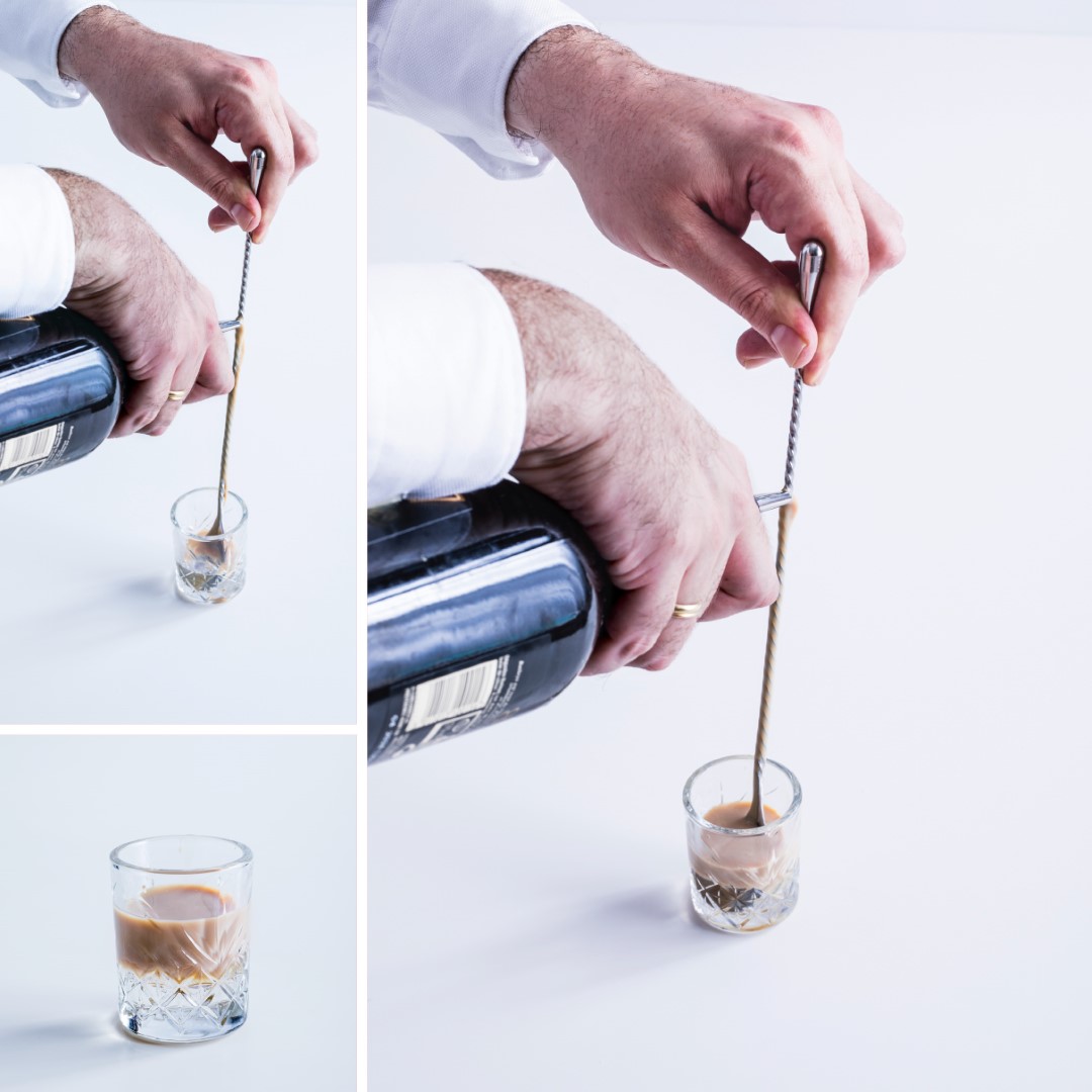 Siempre hay que agitar bien el recipiente manteniéndolo a 120° para asegurarse de verter la totalidad del cóctel.