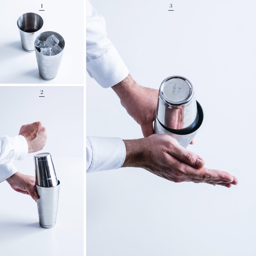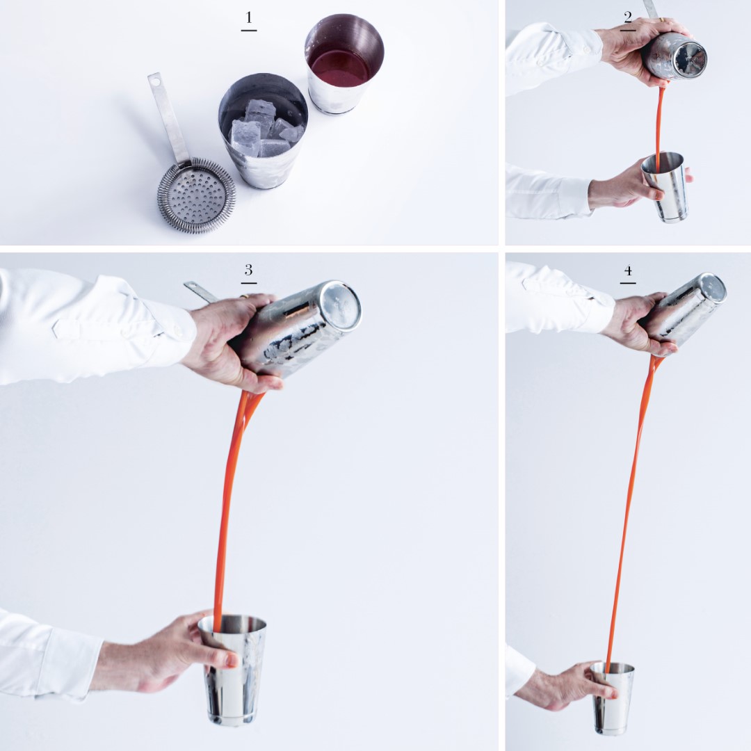 4 Vertemos desde la parte pequeña de la coctelera hacia la parte grande, o colocamos la parte grande sobre la pequeña con un movimiento limpio y rápido.