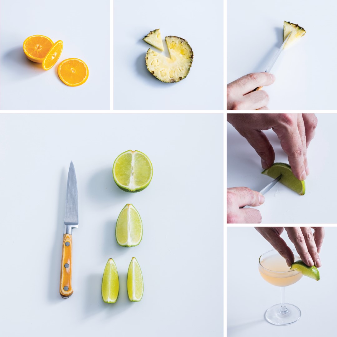 1 Disponemos todos los elementos necesarios, preparamos los ingredientes y los utensilios (pág. 54). Comprobamos que la coctelera esté limpia y completa.