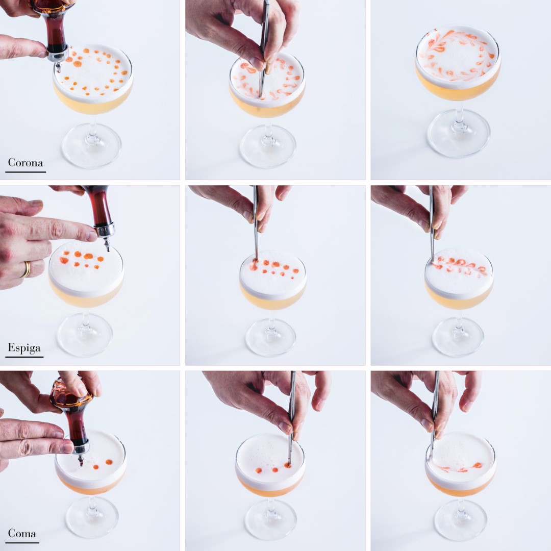 Método para decorar la superficie de un cóctel con la ayuda de un bitter (concentrado aromático) o cualquier otro líquido lo bastante ligero para permanecer sobre la espuma sin hundirse. Interés estético y, a veces, gustativo u olfativo.
