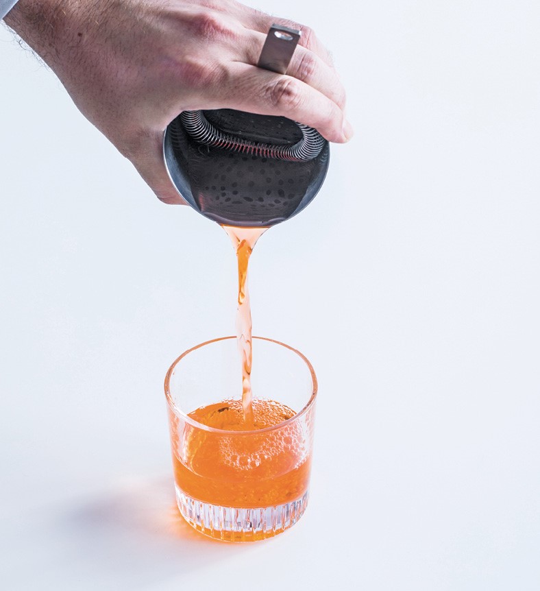 4 Vertemos sujetando ambos coladores para colar dos veces el cóctel.