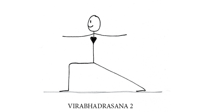 Virabhadra es un guerrero legendario de la mitología védica. En el camino del yoga se requiere la fortaleza y resistencia propias del guerrero para avanzar, purificando el cuerpo físico y la mente. La tarea más ardua del yogi y la yogini es la de disolver el ego, creando así espacio para canalizar vibraciones elevadas de Luz, Sabiduría y Amor universales. La práctica de Virabhadrasana 2 nos enseña a desarrollar las cualidades del guerrero de la luz, aquel que mantiene su corazón abierto y en paz, a la vez que se involucra en las aventuras mundanas con determinación y firmeza.