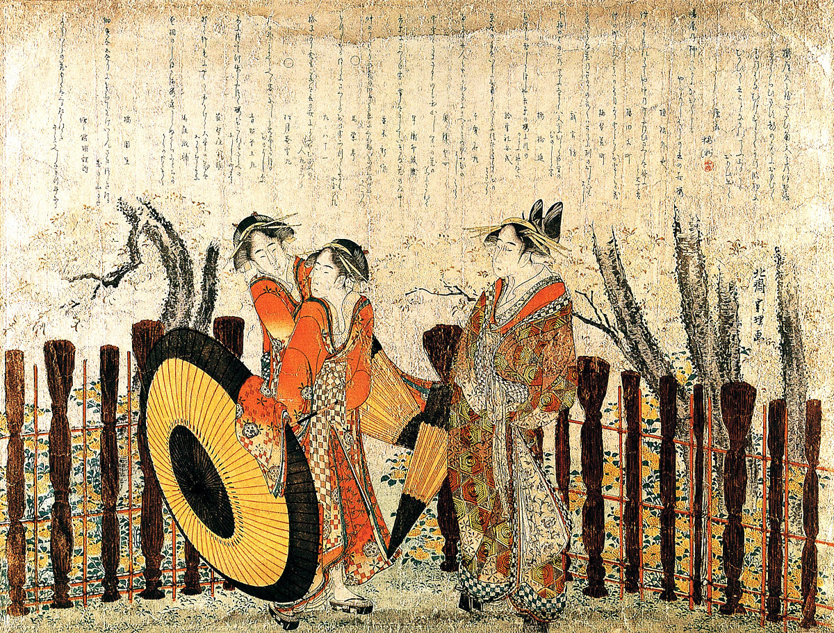 An Oiran and Her Two Shinzō Admiring the Cherry Trees in Bloom in Nakanocho, c. 1796-1800
