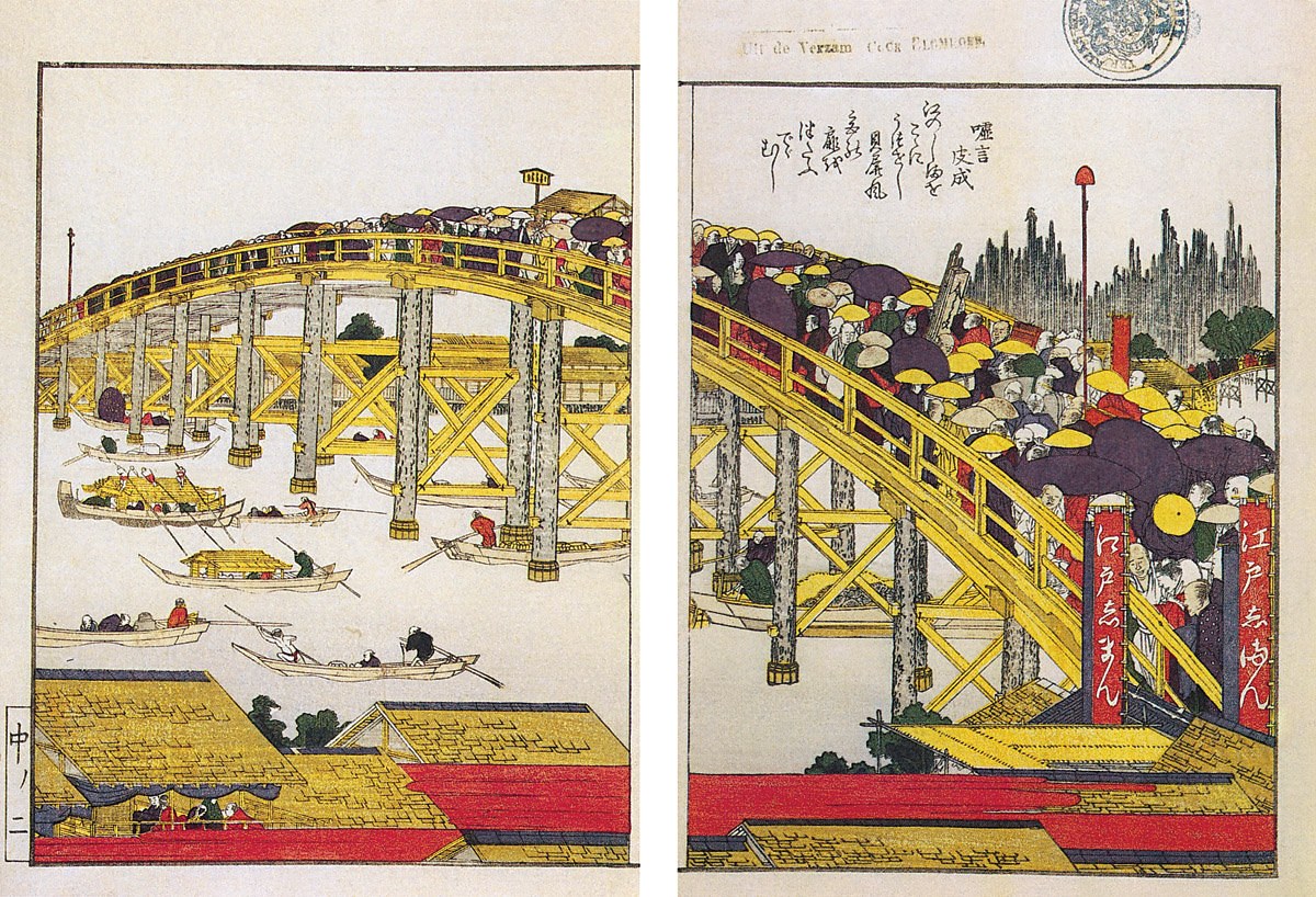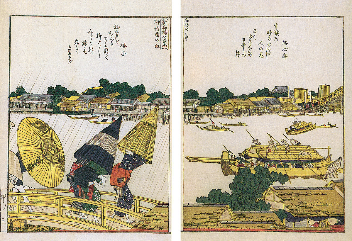 Panoramic View of the Sumida Banks with the Shin Yanagibashi and Ryogokubashi Bridges, from the Illustrated Book of the Two Banks of the Sumida in One View (Ehon Sumidagawa ryogan ichiran), c. 1803
