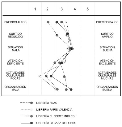 A partir de las medias obtenidas en las valoraciones de los atributos de las cuatro librerías, es posible representar un perfil para cada una de ellas uniendo con una línea tales valores, tal y como se muestra en el gráfico 1, y así realizar un análisis comparativo entre estos establecimientos en función de la percepción que el público tiene de ellas.
