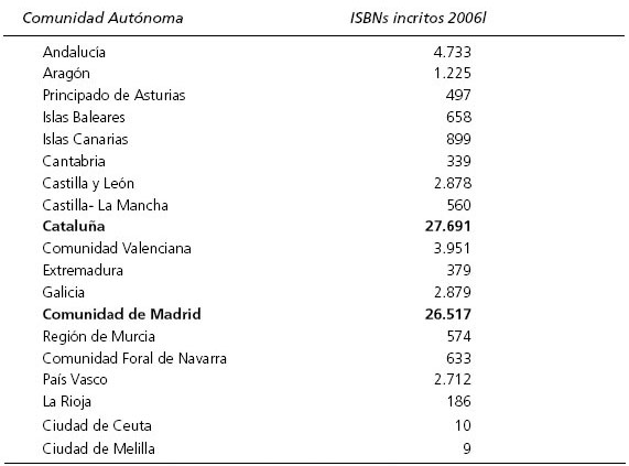 El volumen de edición varía considerablemente entre las Comunidades Autónomas en nuestro país. Tal y como se observa en la tabla 2, la edición se concentra principalmente en dos grandes núcleos: la Comunidad de Madrid y Cataluña con 26.517 y 27.691 ISBNs inscritos respectivamente durante 2006, lo que supone más de un 70% del volumen total de la edición en España. Andalucía y Comunidad Valenciana son las dos comunidades con mayor número de ISBNs inscritos dentro del grupo minoritario de la edición global española.