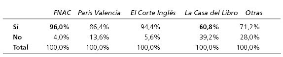 A la vista de estos resultados, podemos afirmar que las cuatro librerías planteadas son ampliamente conocidas por los individuos de la muestra. En concreto la FNAC y El Corte Inglés son las librerías más conocidas con resultados del 96,0% y 94,4% del total de individuos encuestados respectivamente. Le sigue en grado de conocimiento, la librería París Valencia al ser señalada por un 86,4% de los individuos. En cambio, el porcentaje inferior, aunque notorio, de conocimiento por parte de los individuos es para La Casa del Libro, que declara conocerla un 60,8% de los encuestados. De igual modo, destaca la opción Otras librerías al haber sido señalada por el 71,0% de las unidades muestrales.