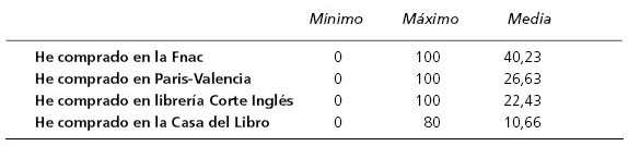 El segundo objetivo específico planteaba conocer información relativa a los hábitos de compra en general y al volumen de compra de libros en las distintas librerías en concreto. Esta última información aparece recogida en la Tabla 4. La medias obtenidas para cada establecimiento representan la cuota de mercado de cada una de ellas.