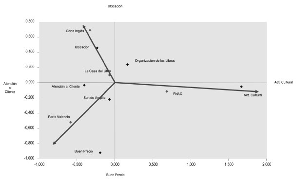 Por último, con el objetivo de analizar el posicionamiento perceptual comparado de las cuatro librerías objeto de estudio a partir de los seis atributos planteados, se llevó a cabo un análisis factorial de correspondencias, una técnica que procesa toda la información anterior pero de manera conjunta. Así, esta técnica de análisis multivariante se interpretó para dos dimensiones al representar éstas el 96,1 % de la información. El examen de los puntos fila y de los puntos columna obtenidos, coordenadas de librerías y atributos respectivamente, nos mostró la calidad de representación de los anteriores (librerías y atributos) sobre los ejes. Así, respecto a las librerías y para un primer eje, se detectó que la Fnac y Paris Valencia estaban bien representadas, aunque de manera opuesta en cuanto a los atributos actividades culturales y atención al cliente. El segundo eje lo constituía Paris Valencia, vinculada a buen precio, en oposición a la librería de El Corte Inglés, asociada a ubicación. De igual modo pero para los atributos o características analizadas, la programación de actividades culturales fue la característica que estaba mejor representada sobre el primer eje seguida de la atención al cliente, ambas de signo contrario. El segundo eje lo constituyeron la ubicación y el precio, características también opuestas.