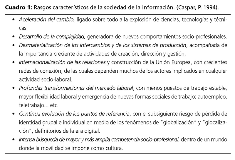 cualquier actividad socio-laboral. Casi sin darnos cuenta, hemos estrenado “una civilización del ser, con su parte equitativa del saber”, como la ha definido J. Lebret. Una serie de rasgos caracterizan la denominada sociedad de la información (Cuadro 1).