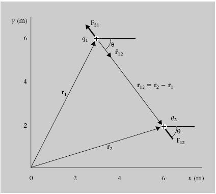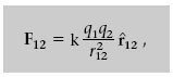 La llei de Coulomb es pot formular matemàticament de la manera següent: siguin q 1i q 2 dues càrregues puntuals separades una distància r 12, que és el mòdul del vector r 12 que va de la posició de q 1a la de q 2 (com es veu a la figura 1.1), aleshores, la força elèctrica F 12 exercida per q 1 sobre q 2 és