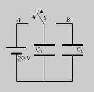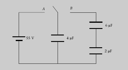 7. Connectem el commutador de la figura 1.41 al punt A, i un cop s’ha carregat el condensador de 4 μF, el connectem al punt B. Quines seran la càrrega i la ddp finals de cada condensador?
