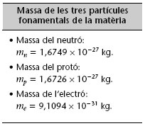 Pràcticament tota la matèria que ens envolta està formada per tres tipus de partícules, els protons (p), els neutrons (n0) i els electrons (e), que acostumen a estar agrupades formant àtoms. Els protons i els neutrons tenen una massa molt semblant de l’ordre de 1027 kg, mentre que els electrons són unes 2.000 vegades més lleugers (vegeu la taula 1.1).