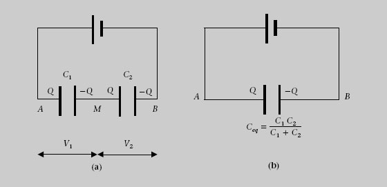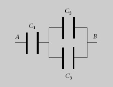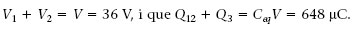 6. Calculeu la capacitat equivalent entre els punts A i B dels dos condensadors de la figura 1.40. Determineu la càrrega i l’energia de cadascun si connectem A i B als terminals d’una bateria de 36 V.