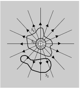 Considerem ara una sola càrrega puntual q i dos tipus de superfícies tancades com les de la figura 1.10: una superfície tancada S 1 que conté q i una superfície tancada S 2 que no la conté. Com es veu a la figura 1.10, el nombre de línies de camp que travessen S 1 és el mateix que el que travessen una superfície esfèrica S 0 de radi R concèntrica amb q. Per tant, el flux del camp elèctric a través de S 1 és el mateix que a través de S 0.