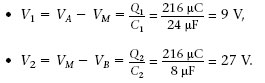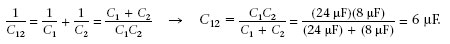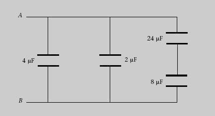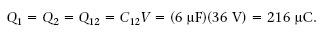 6. C eq = 12 μF, Q 4 = 144 μC, Q 2 = 72 μC, Q 8 = Q 24 = 216 μC, U 4 = 2,592 mJ, U 2 = 1,296 mJ,