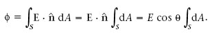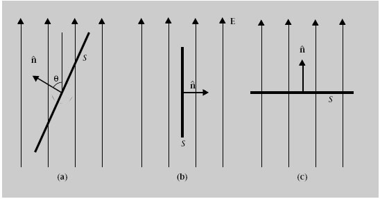 En una superfície plana n és el mateix en tots els punts (figura 1.9) i el seu producte escalar amb un camp E uniforme té un valor constant E · n = E cos θ, on θ és l’angle que forma E amb ṋ (figura 1.9a). Aleshores aquesta constant es pot treure fora de la integral que defineix el flux: