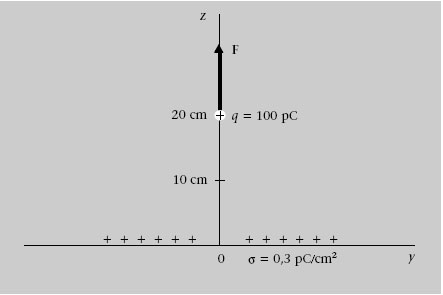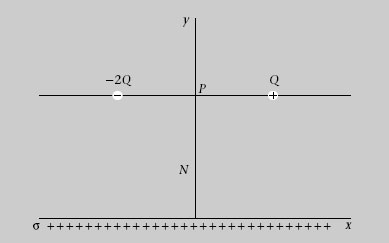 3. El sistema de càrregues de sota consisteix en un pla, que podem considerar infinit, carregat uniformement amb una densitat superficial de 1 nC/m2, i dues càrregues puntuals -2Q i +Q, amb Q = 0,4 nC, situades a 0,1 m del pla i separades 0,15 m.