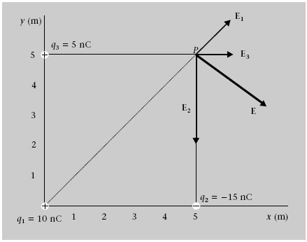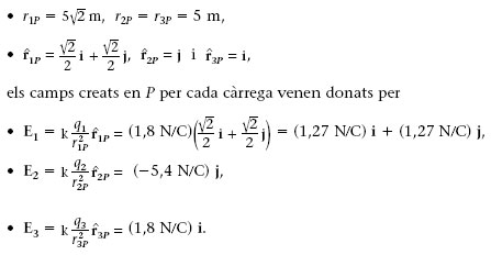 Les càrregues q 1 = 10 nC, q 2 = -15 nC i q 3 5 = nC de l’exemple 1.2 estan en els punts (0 m,0 m), (5 m,0 m) i (0 m,5 m), respectivament (vegeu la figura 1.4). Quin és el camp elèctric creat per les tres càrregues en el punt P = (5 m,5 m)?