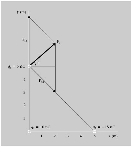 Com s’indica a la figura 1.2, una càrrega positiva q 1 = 10 nC es troba a l’origen de coordenades i una càrrega negativa q 2 = -15 nC està en el punt (5 m,0 m). Quina força fan aquestes dues càrregues sobre una tercera q 3 5 5 nC que està en el punt (0 m, 5 m)?