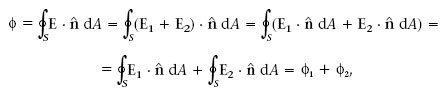 Tenint en compte que el camp E degut a dues càrregues puntuals q 1i q 2 és la suma dels camps E 1 i E 2 creats per cada càrrega per separat, es dedueix que el flux net φ a través d’una superfície tancada S també és la suma dels fluxos φ1 i φ2 produïts per cada càrrega per separat. És a dir,