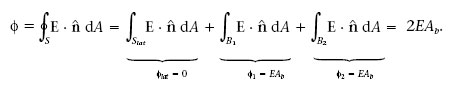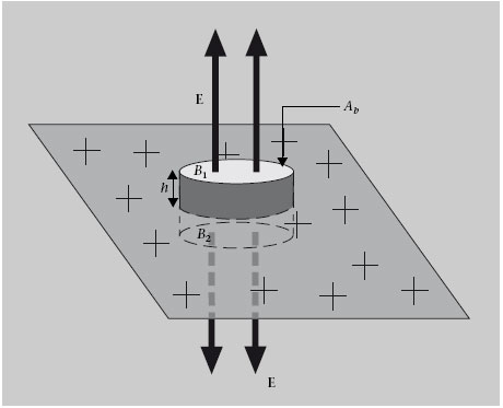 Amb aquesta informació, podem determinar el flux del camp elèctric a través de la superfície d’una caixa cilíndrica com la de la figura 1.13. Les dues bases del cilindre, B 1i B 2, estan a la mateixa distància h del pla i l’àrea de cada una és A b . El flux φ a través d’aquesta superfície gaussiana és igual al flux a través de la superfície lateral del cilindre, S lat , més el flux a través de les bases.