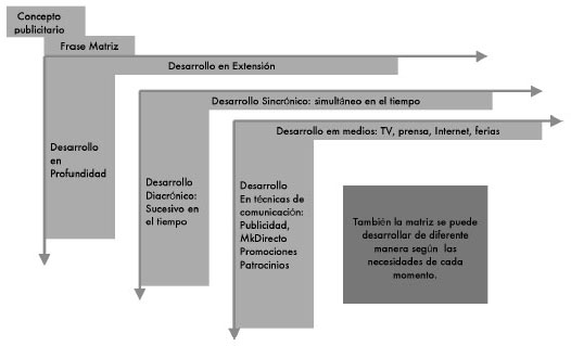 En el siguiente esquema podemos ver una matriz general para un desarrollo redaccional. En ella se contempla la idea, el concepto y la frase matriz de la que se derivará toda la conjugación de textos en sus dos ejes: extensión y profundidad.