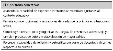 El e-portfolio es el resultado de un cambio social, educativo y tecnológico, utilizado para almacenar información y actualizarla continuamente, para evidenciar cómo se asimilan conocimientos e identificar y valorar el producto del conocimiento; podríamos decir que es una oportunidad para aprender y mostrar lo aprendido en contextos en continuo cambio que requieren una actualización de conocimientos y aprendizaje continuo.
