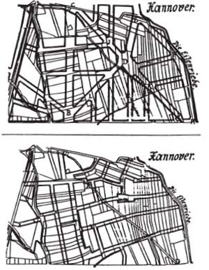 Sitte: Proposición para Eilemriede en Hannover, Alemania. El diseño es interesante en cuanto que Sitte respeta las líneas de propiedad antiguas.