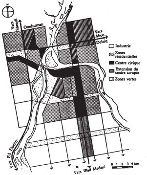 Doxiadis: Planta esquemática de Khartoum. Muestra la zonificación y el vector de crecimiento según la teoría de Dynapolis del autor.