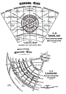 E. Howard: Gráficos de los libros «tomorrow» y «Garden city», publicados en 1898. Se muestra la ciudad jardín y un sector en plano esquemático