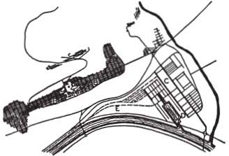 T. Garnier: Ciudad Industrial en que se han confirmado elementos lineales y concéntricos, del año 1977. A: Centro cívico, B: Distrito residencial, C: Distrito industrial, D: Puerto, E: Vía ferroviaria.