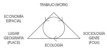 Estos tres elementos organizan los complejos componentes y las variadas disciplinas del urbanismo: Trabajo, las ciencias económicas; Lugar, la geografía y los procesos de asentamientos humanos y; Comunidad, que representa los componentes y disciplinas propios de la sociología.