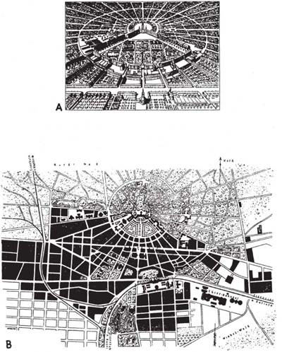 La dificultad y el enmarcamiento teórico y metodológico en arquitectura se perfilaron desde el siglo XIX, con la separación gradual entre arquitectura e ingeniería, que se acentuó con la Revolución Industrial. Se centró —como expone brillantemente Gideon— en problemas referidos a la arquitectura de las ciudades, que superaron los códigos estéticos formales y el valor representativo que alcanzó la gran arquitectura urbana del Barroco y Neoclásico de los siglos XVII hasta fines del XVIII4. Especialmente el urbanismo de las capitales europeas que, desde la reconstrucción de Londres después del incendio de 1666, a los grandes esquemas urbanos realizados por las monarquías absolutas de Europa, como son Roma, Versalles, Nancy, Karlsruhe, Postdam y San Petersburgo, se mantienen inmovilizados como modelos de la ciudad «clásica» hasta la era industrial. Esto sucede especialmente en Occidente. En otras culturas, los procesos históricos fueron diferentes, y si bien el modelo occidental se extenderá por toda la época moderna, su lógica formal y técnica no será mantenida (figuras 2.3 y 2.4).
